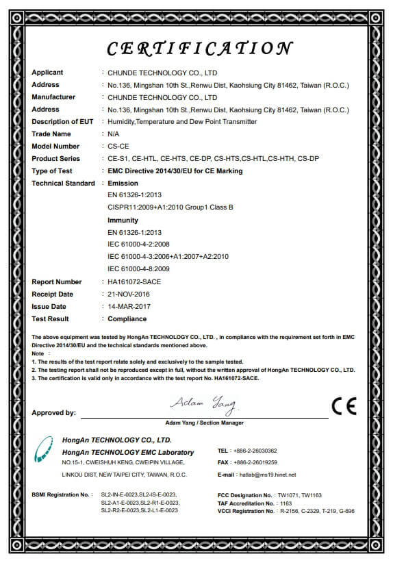 CE認證-CS、CE溫濕度證書